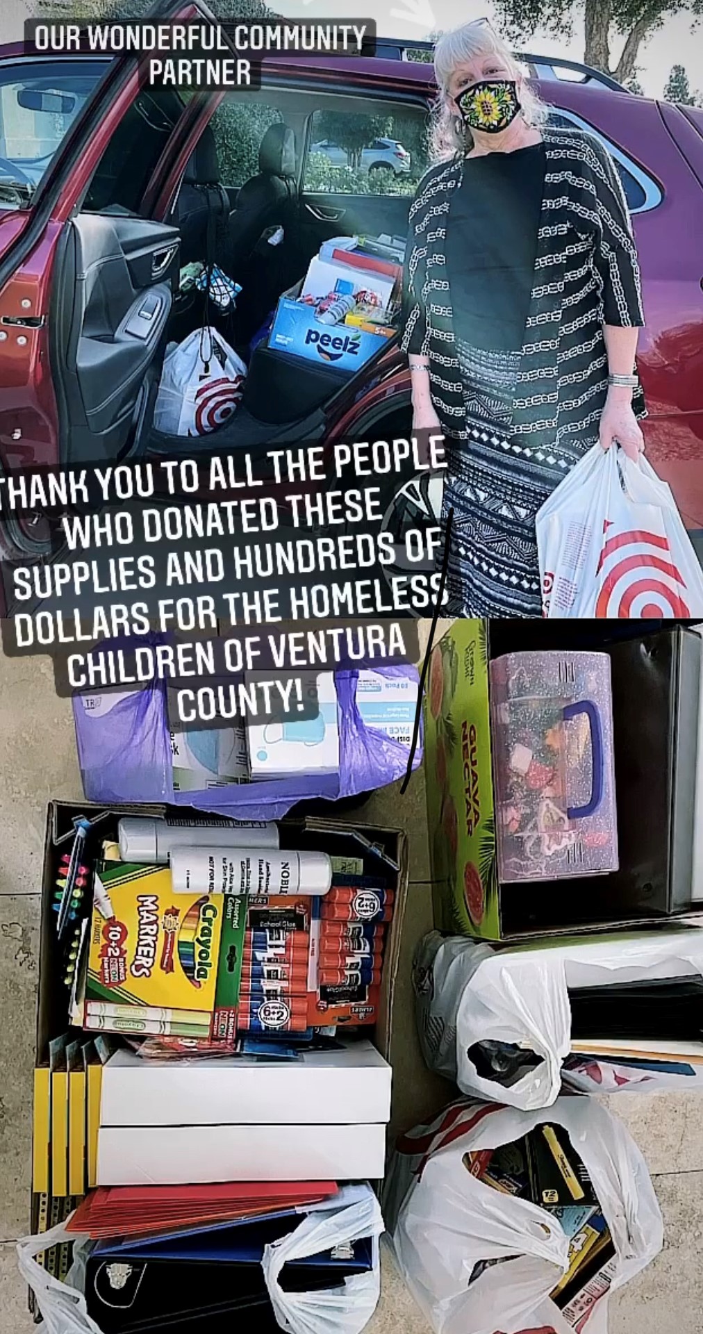 We partnered with Ventura County Homeless education program. The program supports three hundred plus homeless kids. The program provided kids with school supplies like binders, folders, calculators, markers, glue sticks etc.